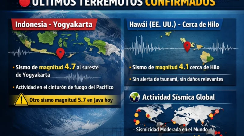 Un sismo de magnitud 4.6 sacudió Yogyakarta, Indonesia, mientras que otro de magnitud 4.7 se registró cerca de Hilo, Hawái, evidenciando la intensa actividad del Cinturón de Fuego del Pacífico.